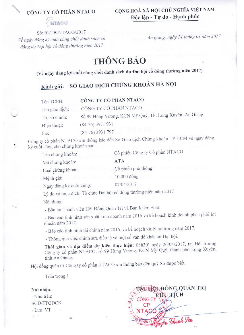 THÔNG BÁO - NGÀY ĐĂNG KÝ CUỐI CÙNG CHỐT DANH SÁCH DỰ ĐẠI HỘI ĐỒNG CỔ ĐÔNG THƯỜNG NIÊN 2017