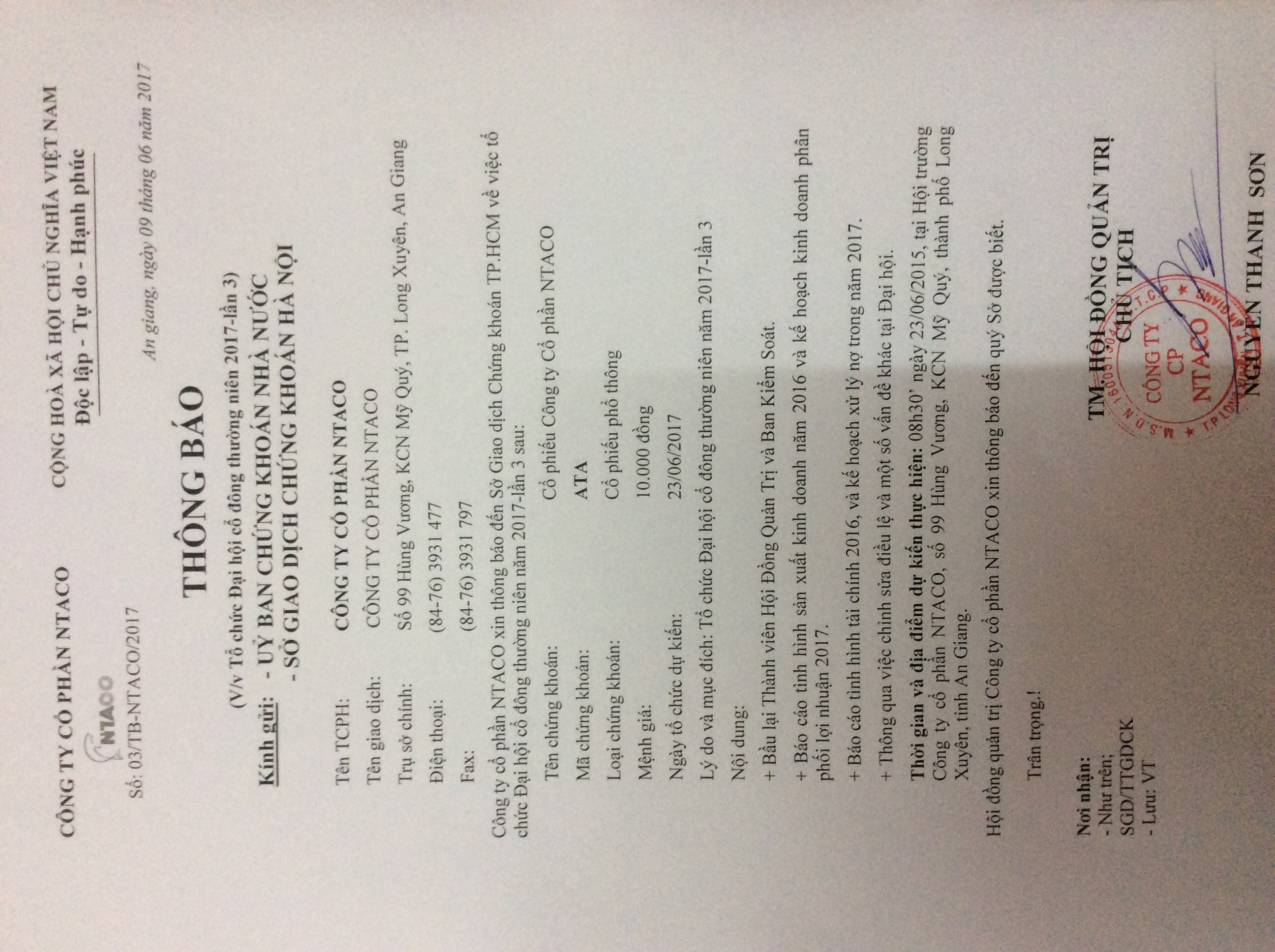 THÔNG BÁO VỀ VIỆC TỔ CHỨC ĐẠI HỘI CỔ ĐÔNG THƯỜNG NIÊN NĂM 2017 LẦN 3