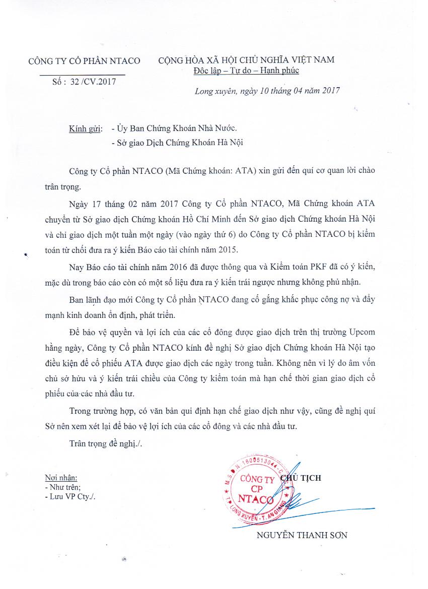 VĂN BẢN ĐỀ NGHỊ SỞ GIAO DỊCH CHỨNG KHOÁN HÀ NỘI TẠO ĐIỀU KIỆN ĐỂ CỔ PHIẾU ATA ĐƯỢC GIAO DỊCH CÁC NGÀY TRONG TUẦN