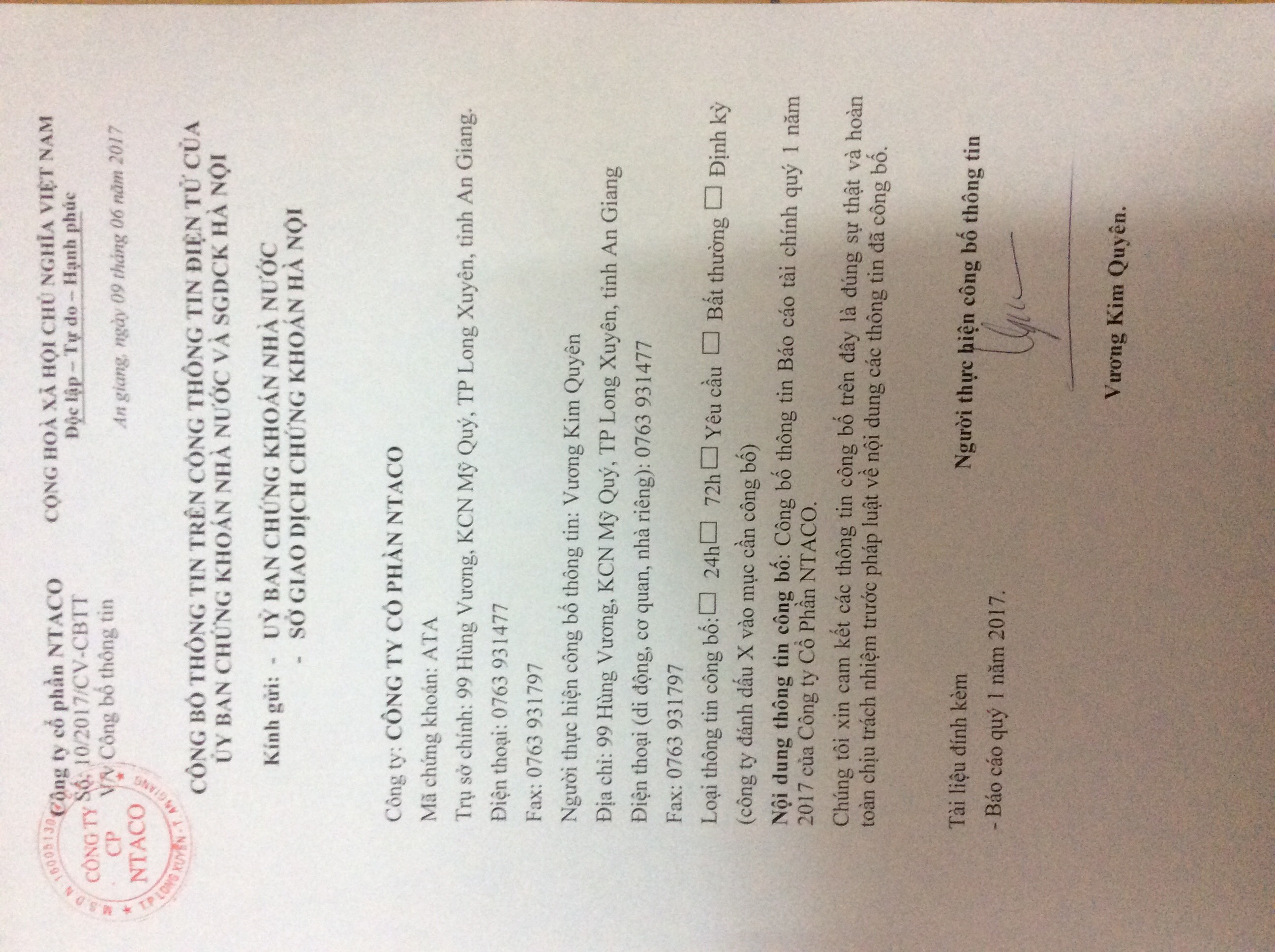 CÔNG BỐ BÁO CÁO TÀI CHÍNH QUÝ 1-2017
