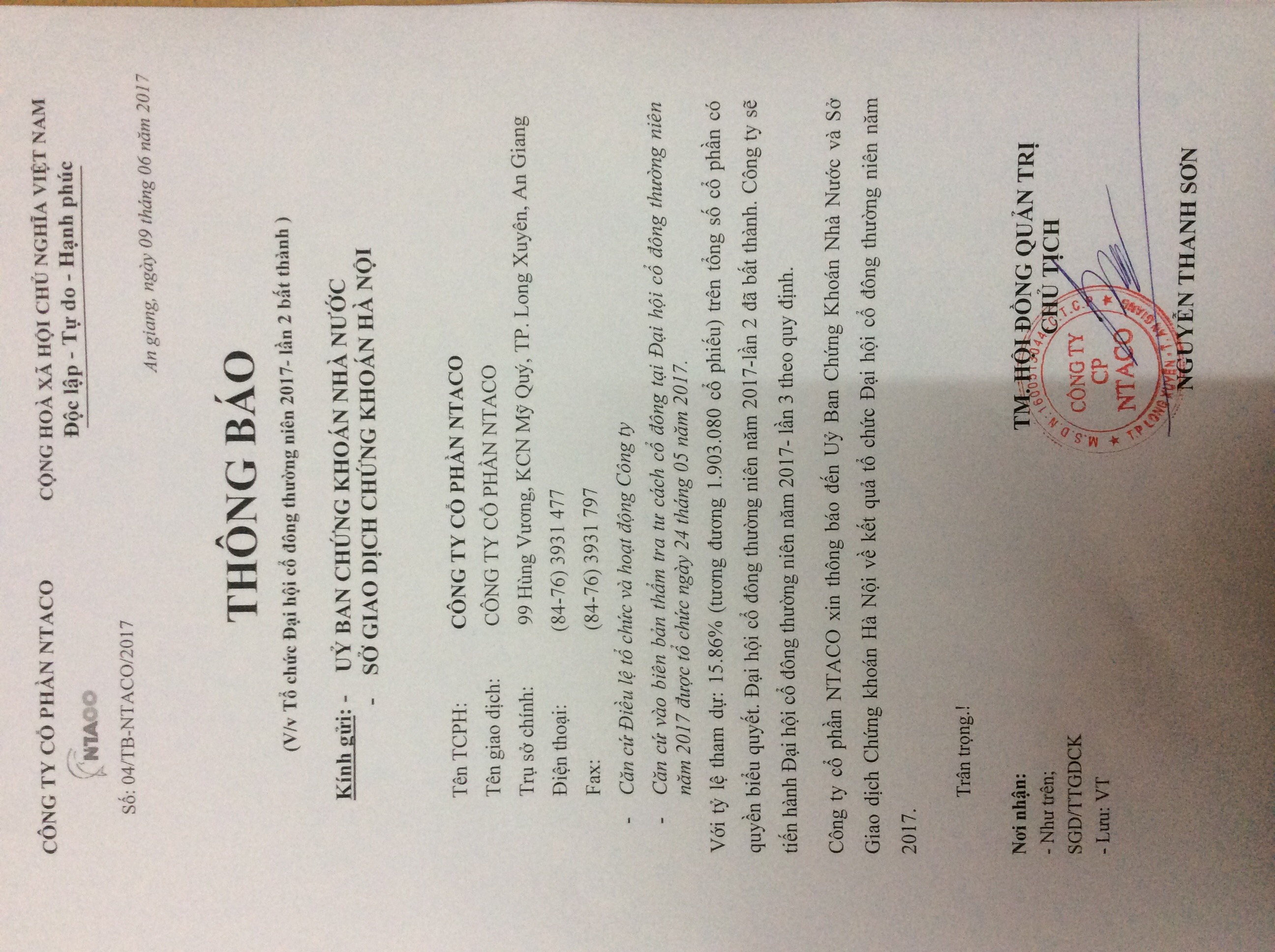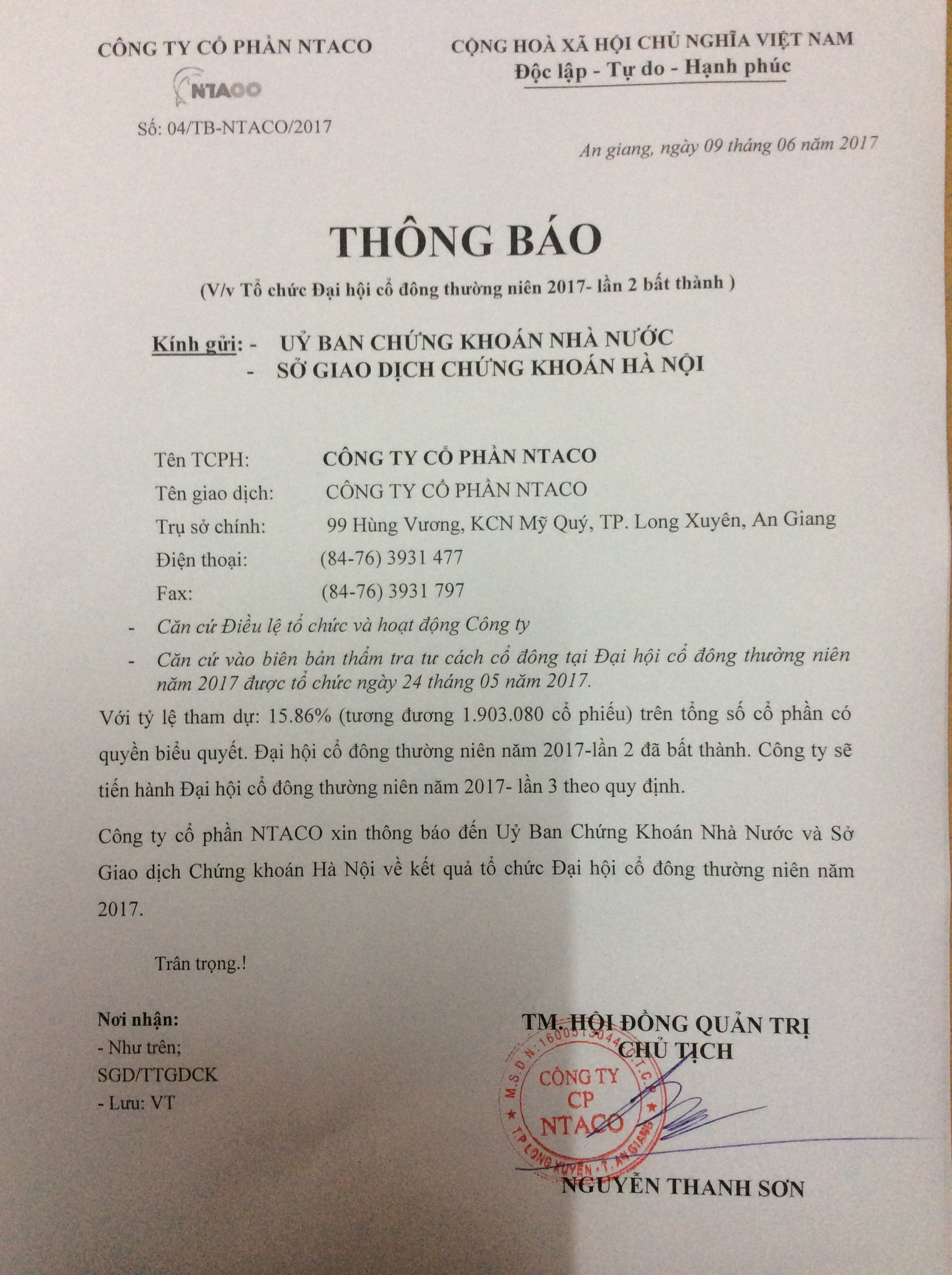 THÔNG BÁO VỀ VIỆC TỔ CHỨC ĐẠI HỘI CỔ ĐÔNG THƯỜNG NIÊN NĂM 2017 LẦN 2 BẤT THÀNH